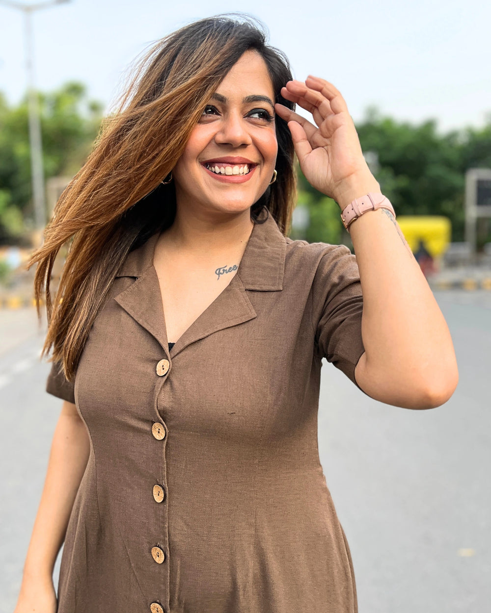 Mocha Brown V-Neck Linen Dress For Women