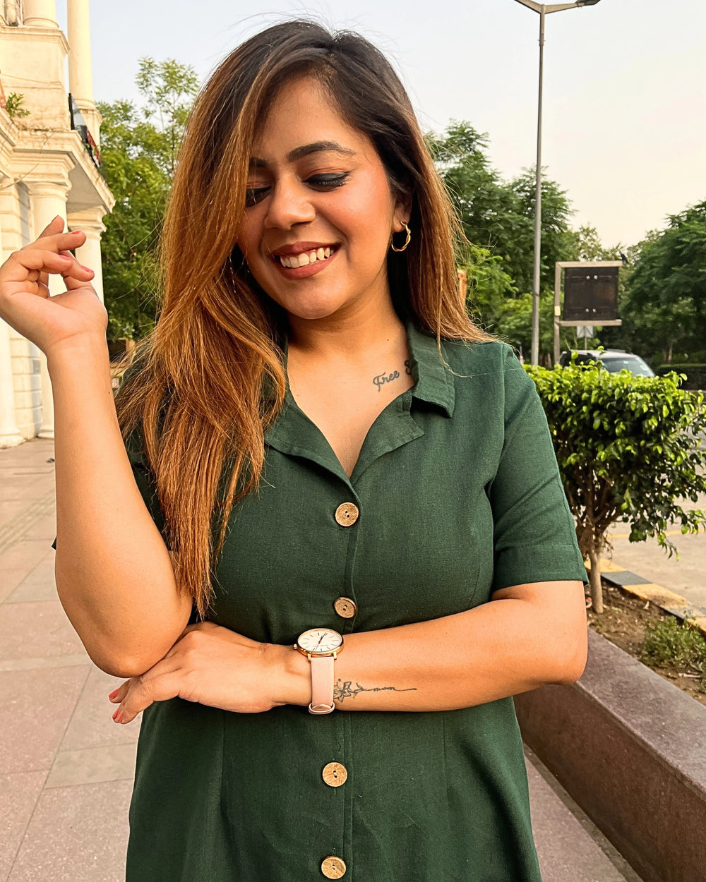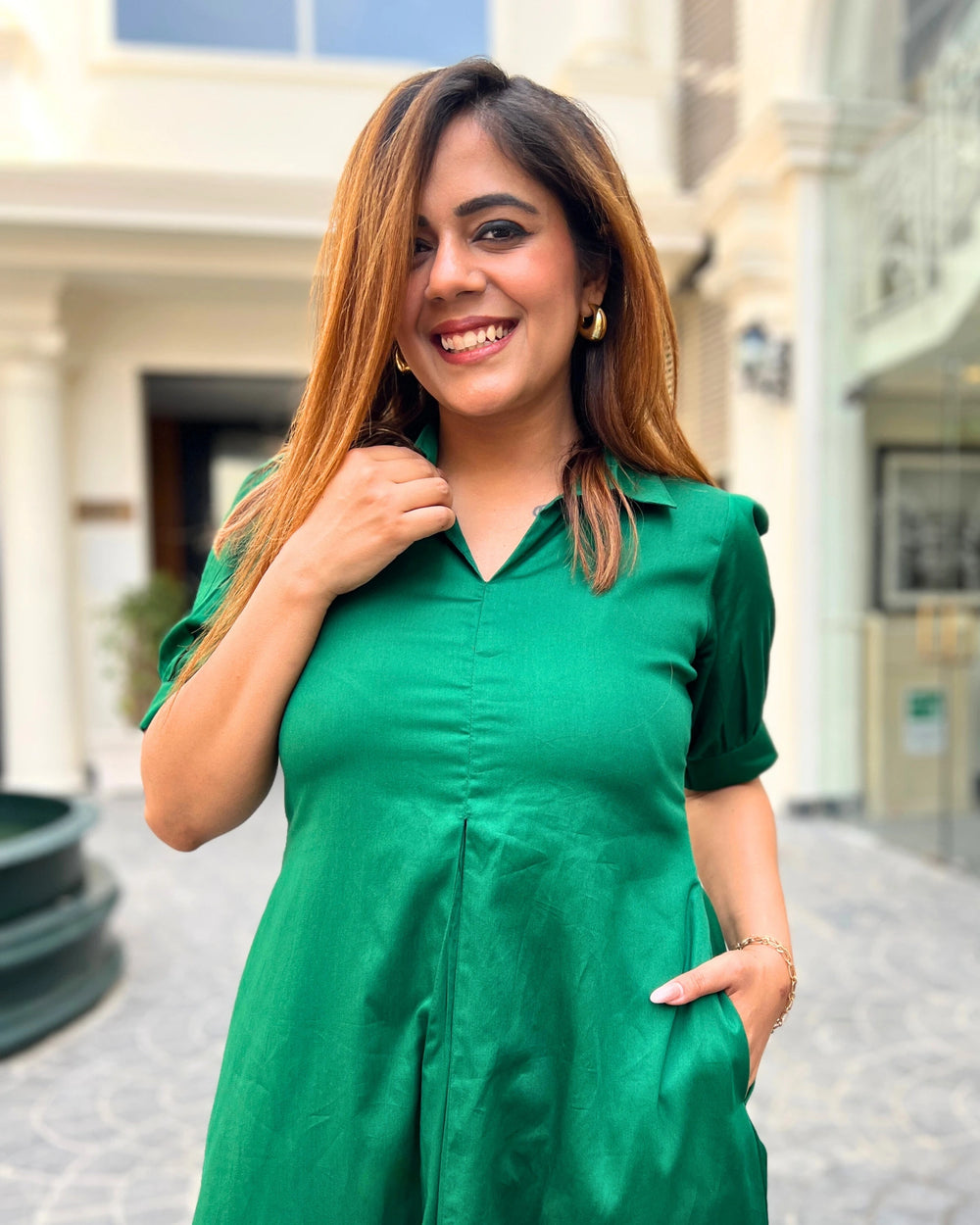 Deep Green All-Day Linen Shirt Dress For Women