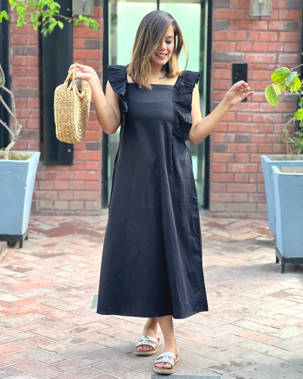Midnight Black Cotton Frill Dress