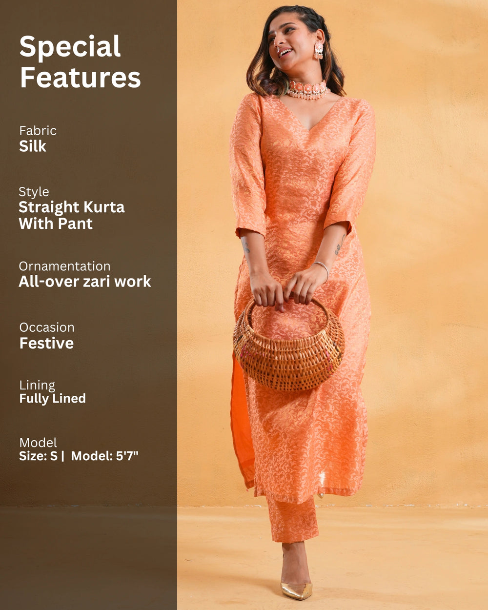 Woman wearing an peach brocade kurta set