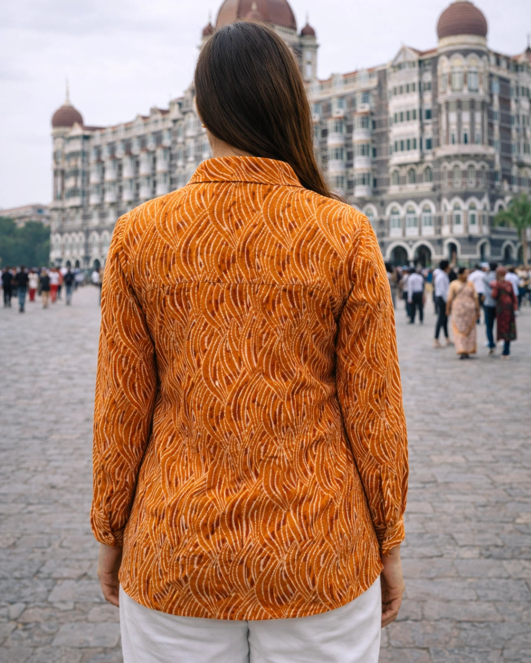 Wavy Mustard Classic Cotton Shirt - Crafted from soft, breathable cotton, this stylish shirt features an elegant white wavy print that adds movement and charm to the rich mustard base. Designed with a smart classic collar and a relaxed fit, it offers all-day comfort while keeping your look polished. Perfect for office wear, casual outings, and effortless everyday styling.