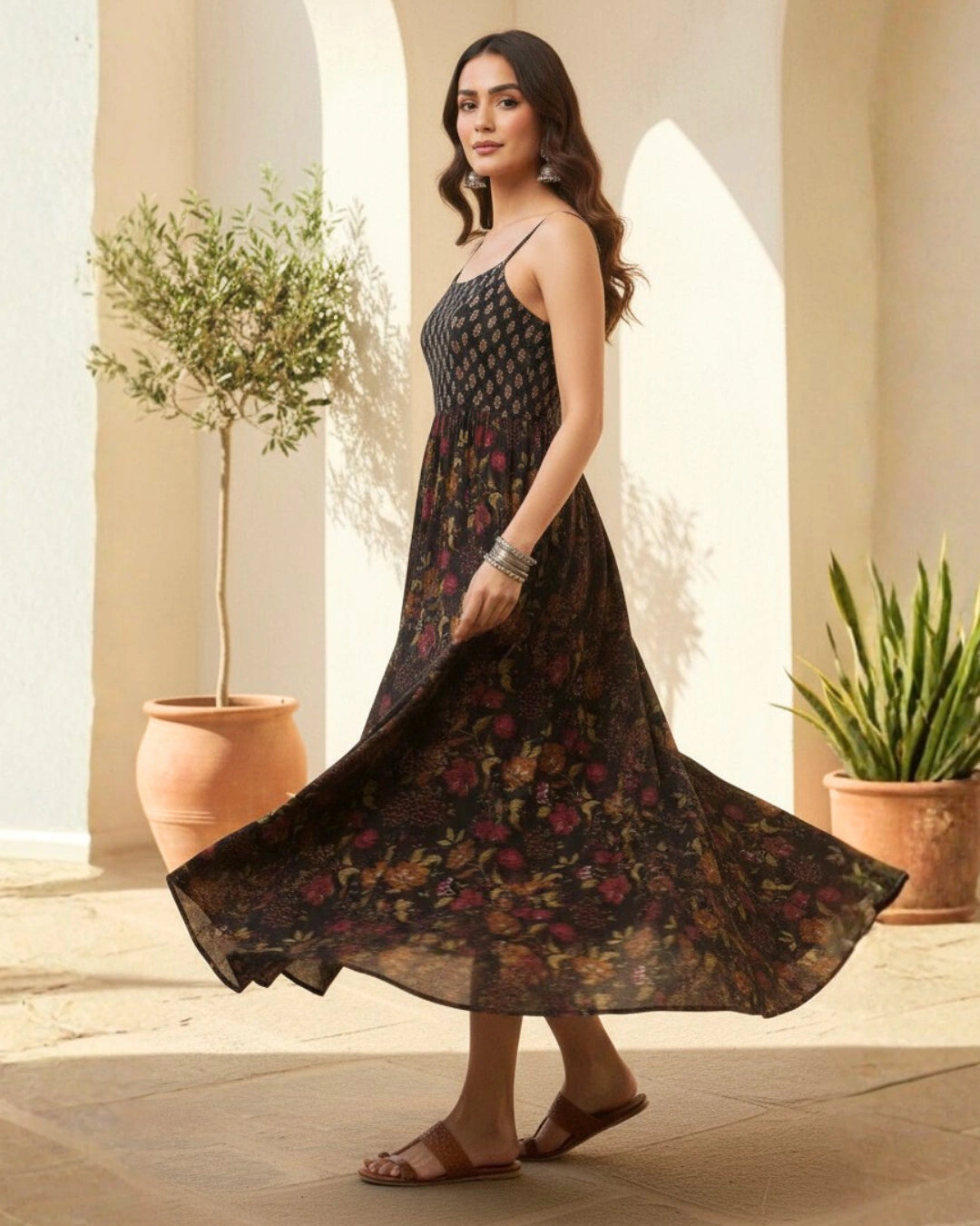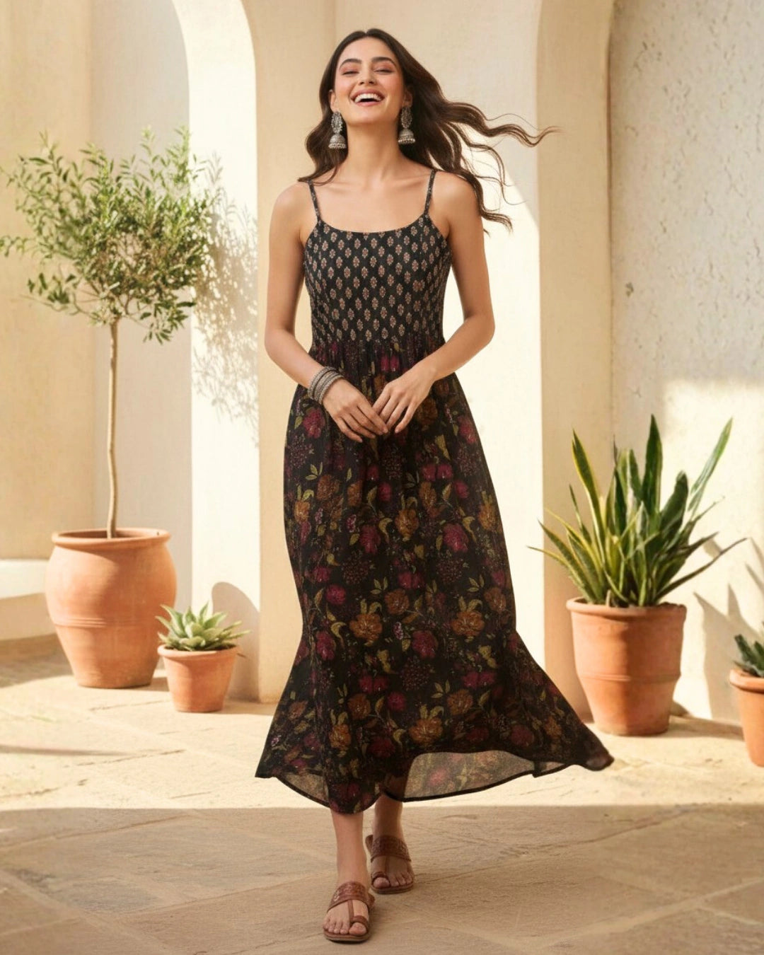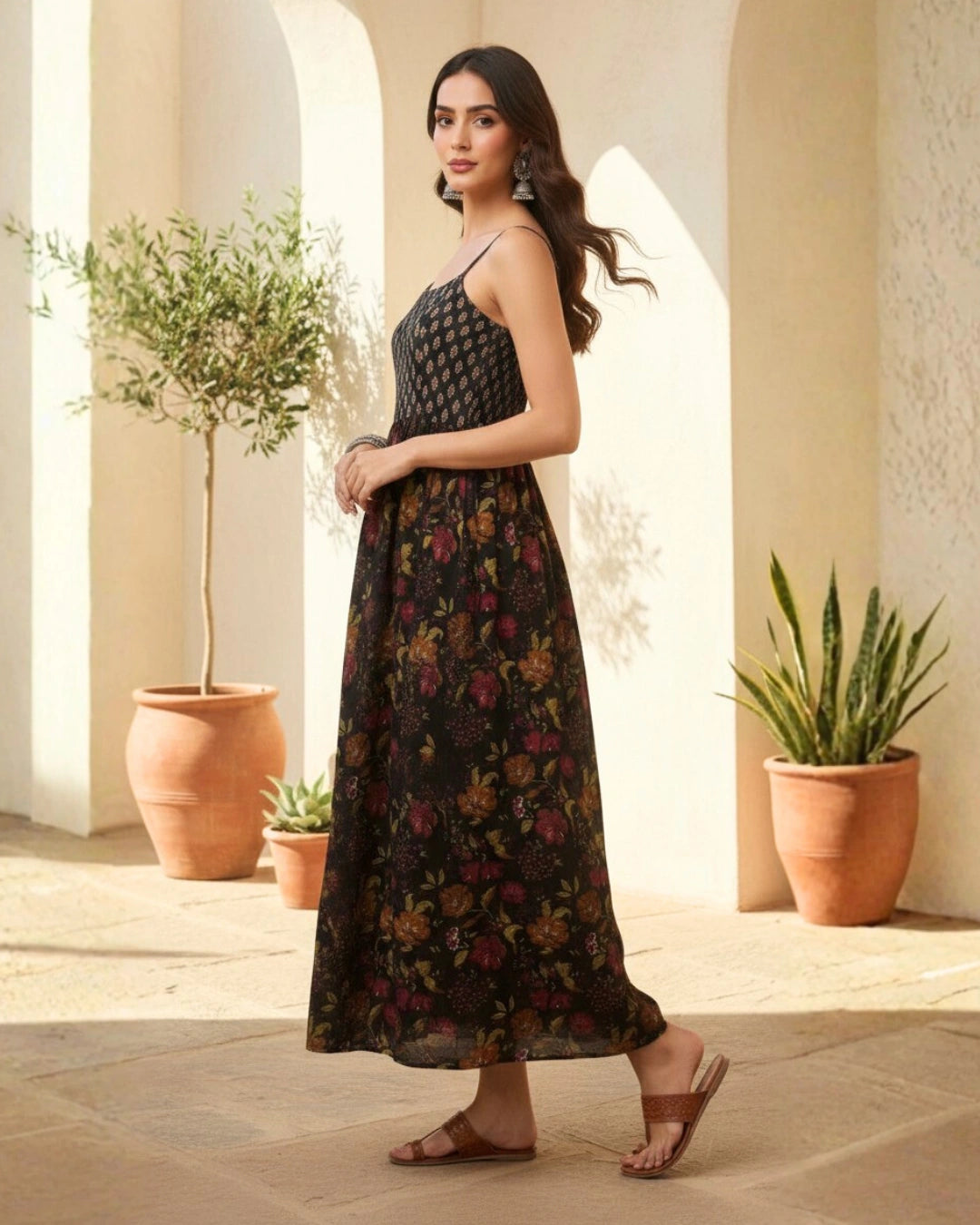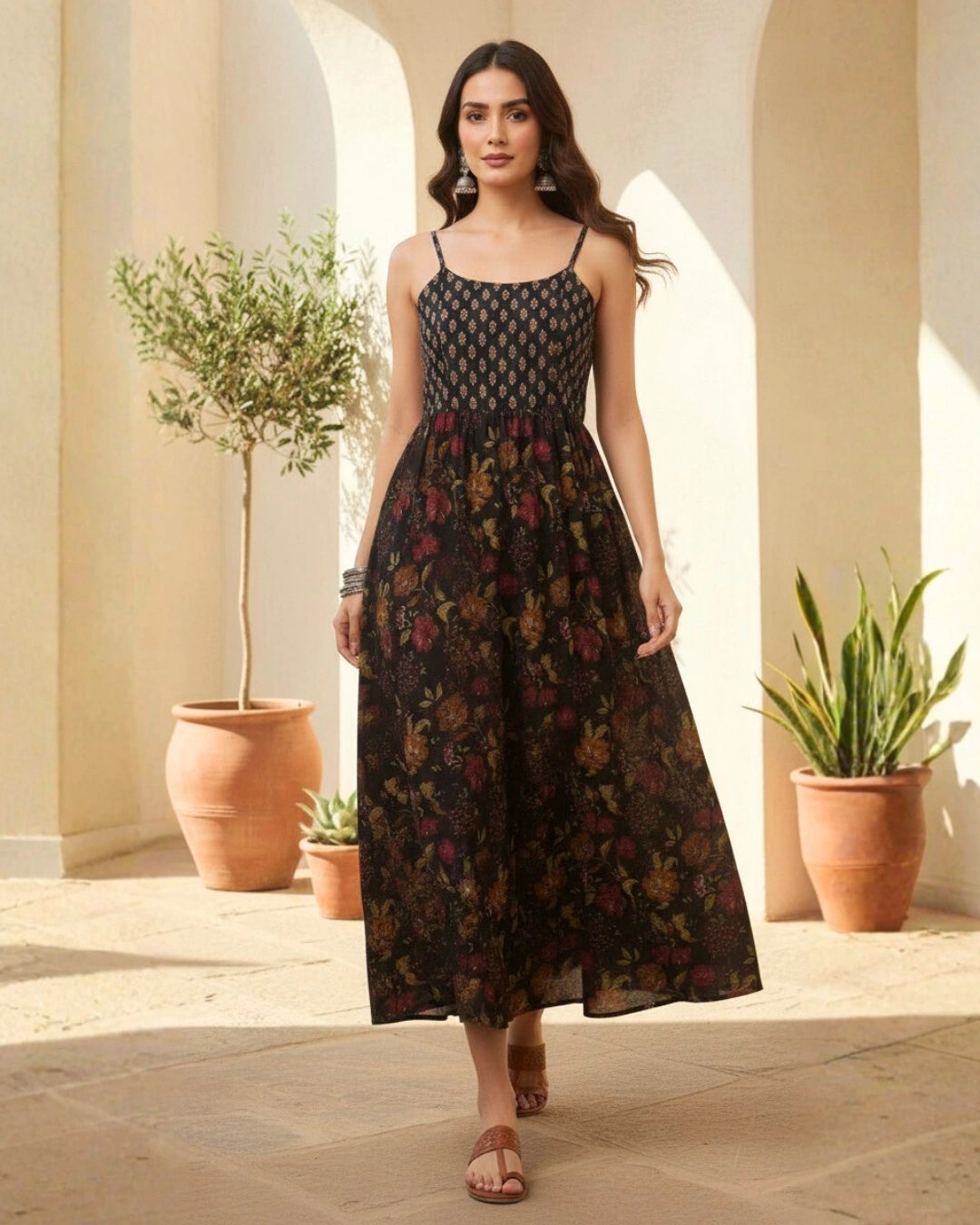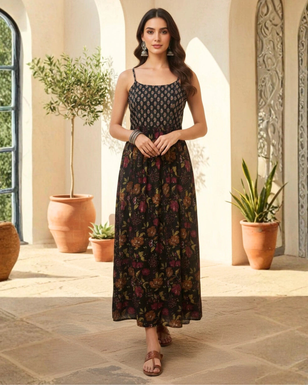 Stay cool and stylish in this Strapy Floral Cotton Maxi Dress, crafted from soft and breathable cambric cotton, perfect for the summer season. Designed with a strapy neckline and sleeveless silhouette, this western wear dress offers a modern and elegant look.