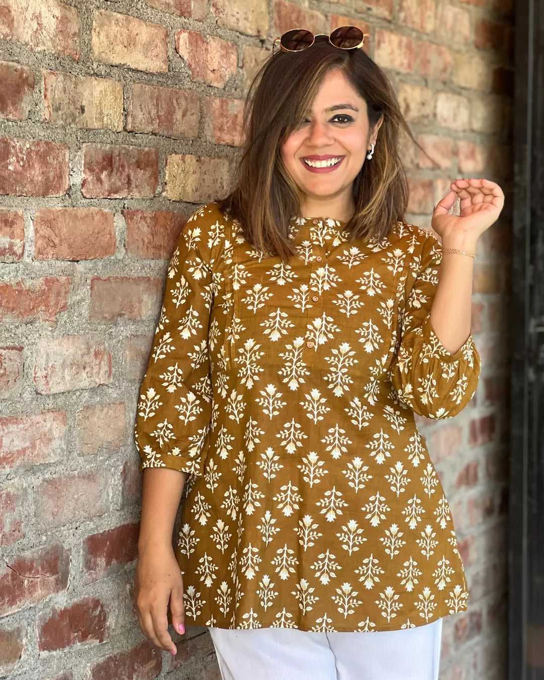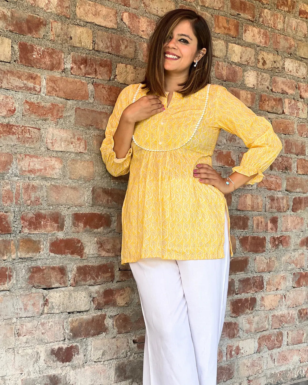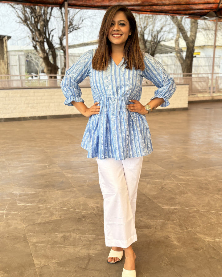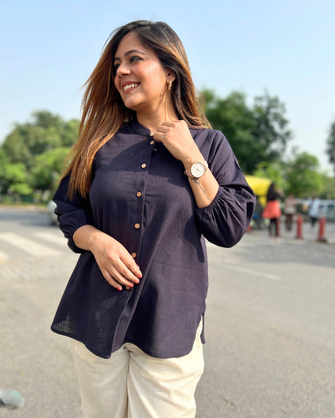 Our Navy Blue Cotton Embroidered Chikankari Short Kurti features elegance with its refined V-neckline and fashionable short sleeves, enriched with exquisite chikankari embroidery. This kurti offers a comfortable fit and timeless elegance.
