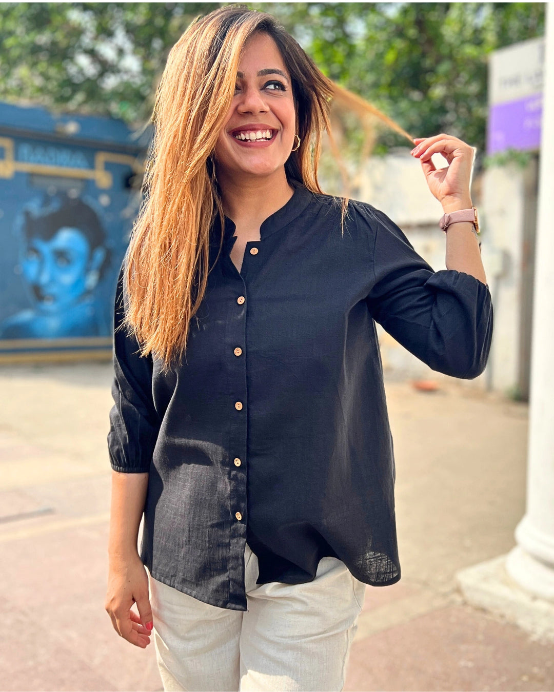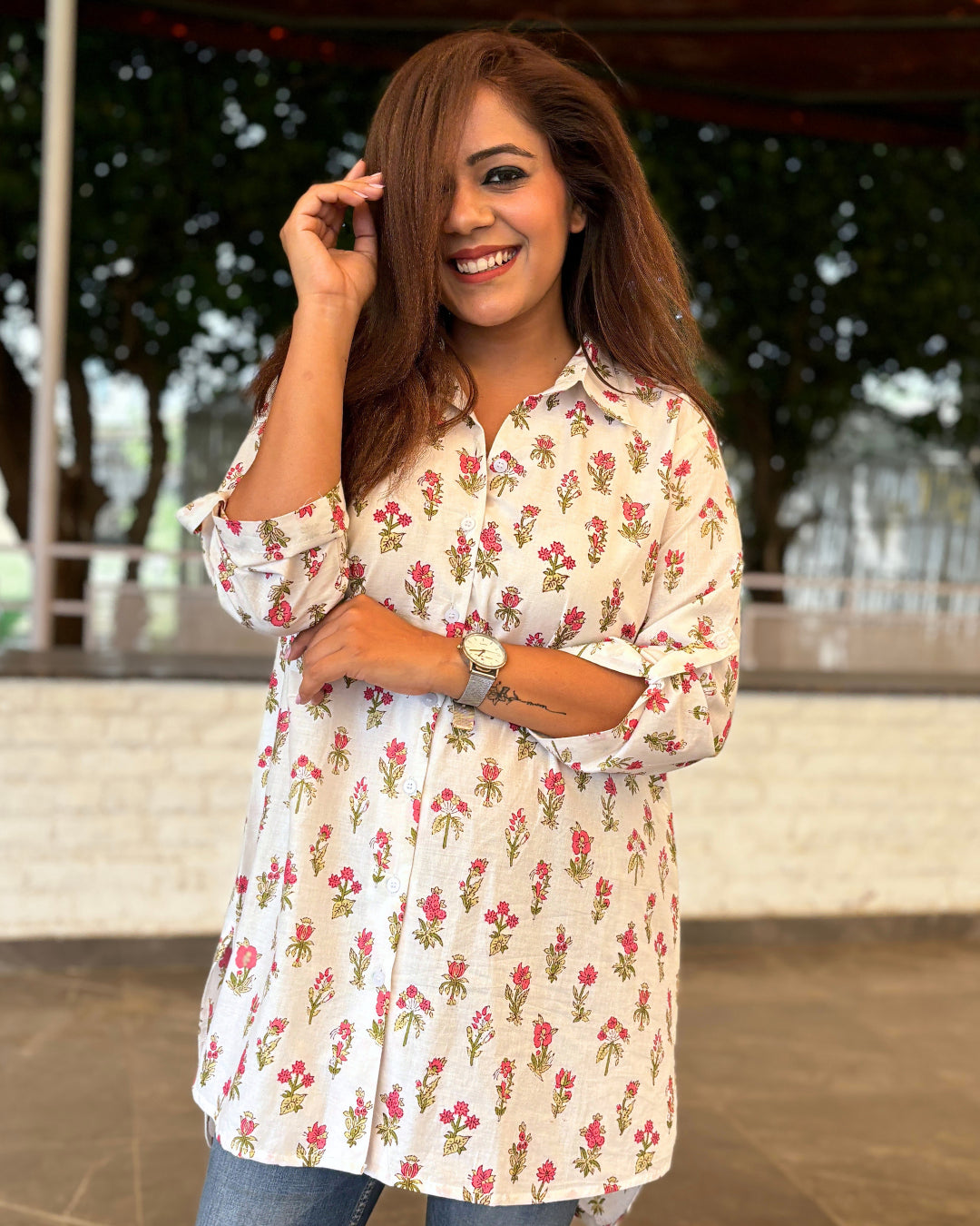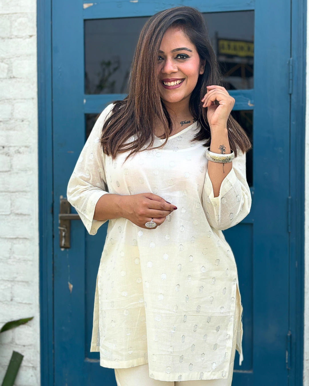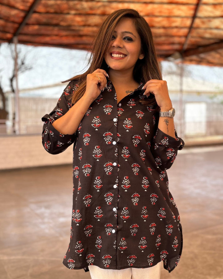 Our Navy Blue Cotton Embroidered Chikankari Short Kurti features elegance with its refined V-neckline and fashionable short sleeves, enriched with exquisite chikankari embroidery. This kurti offers a comfortable fit and timeless elegance.