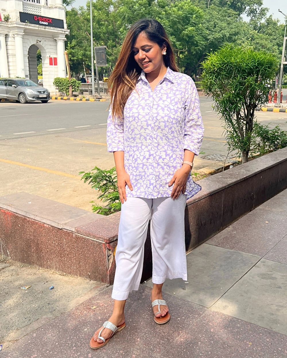 Add a soft, graceful touch to your everyday look with our Pastel Lavender Floral Cotton Shirt for Women. Crafted from 100% breathable cotton, this shirt is perfect for the summer season. The soothing pastel lavender hue combined with delicate floral prints brings out a feminine charm, while the A-line silhouette, high-low hem, and folded 3/4th sleeves offer comfort and effortless style. Ideal for office wear, casual outings, or weekend plans.