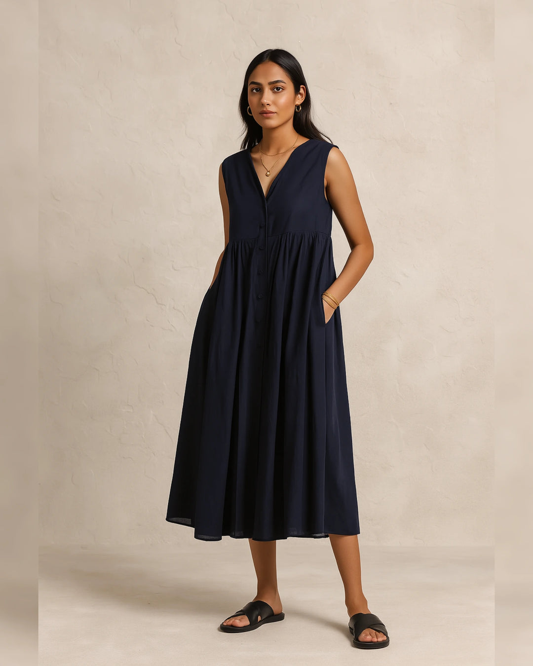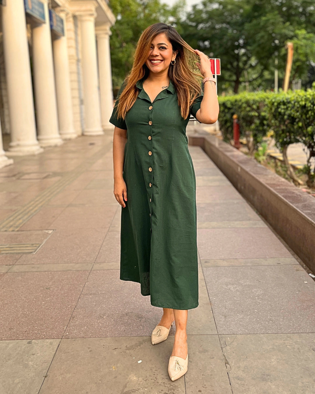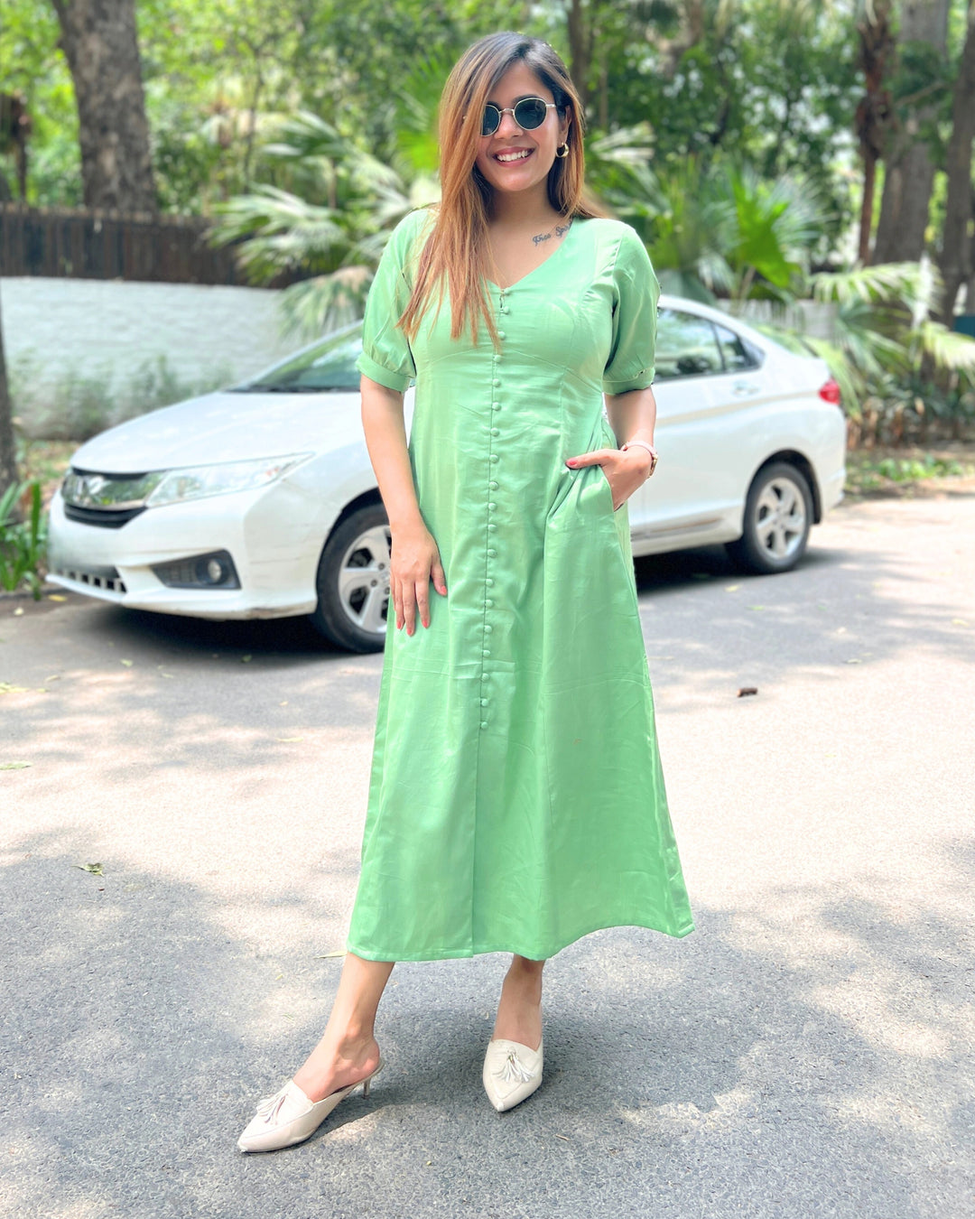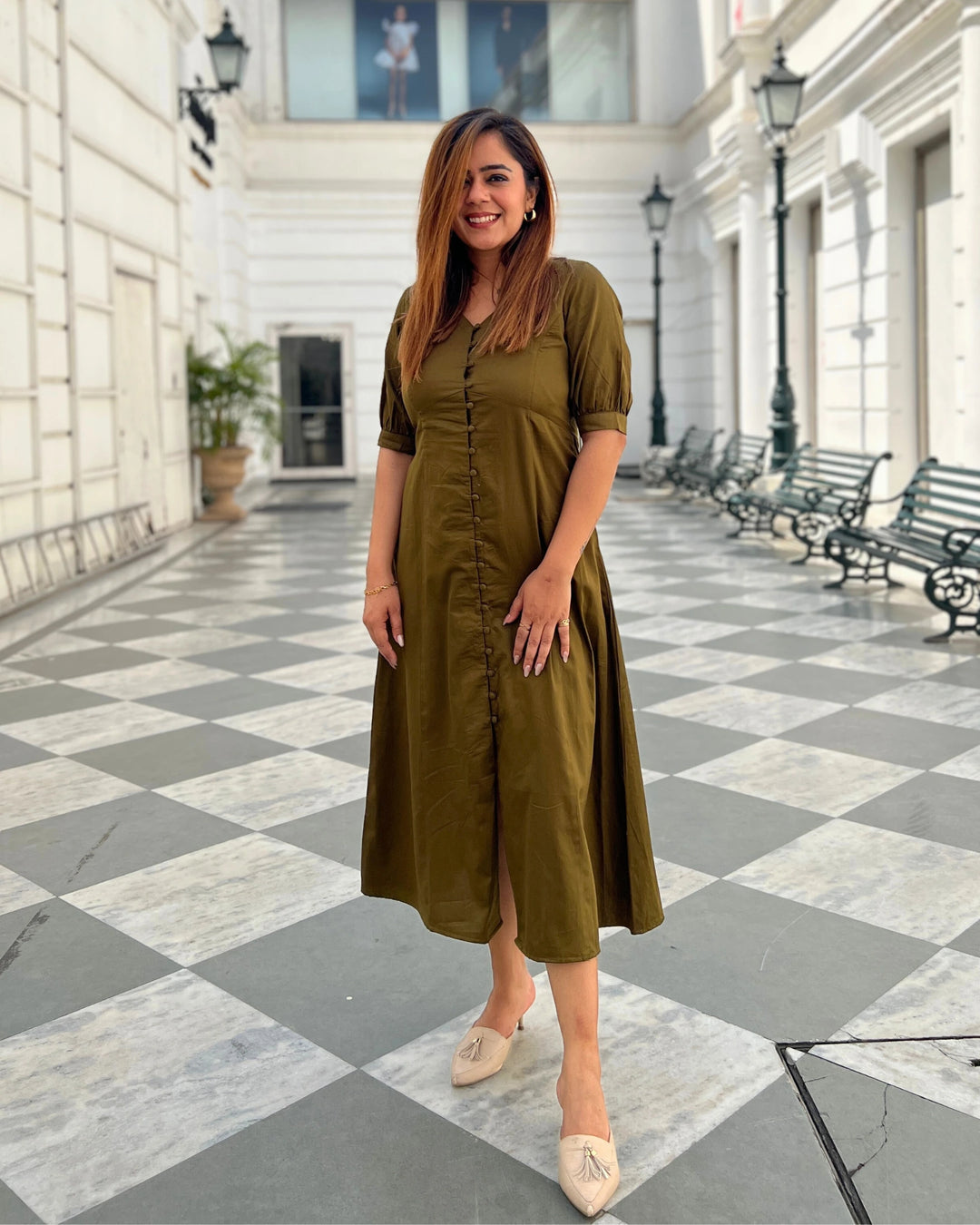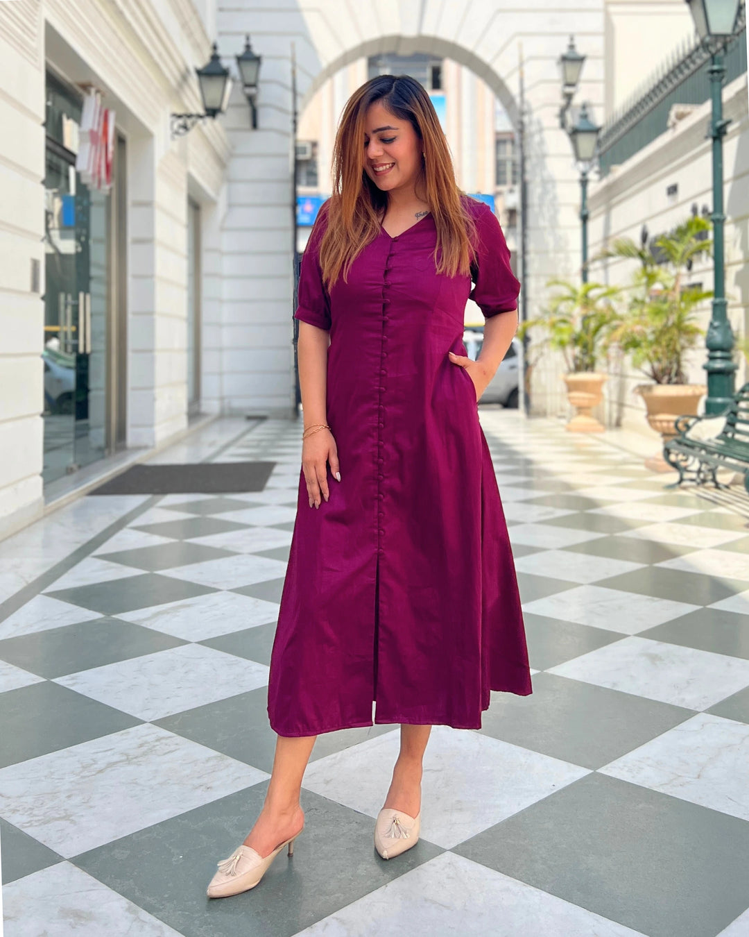 Step into a world of charm with our floral schiffli print midi dress. Crafted from soft cotton, it features a stylish V-neck and flared sleeves, combining comfort and femininity for a versatile addition to your wardrobe.