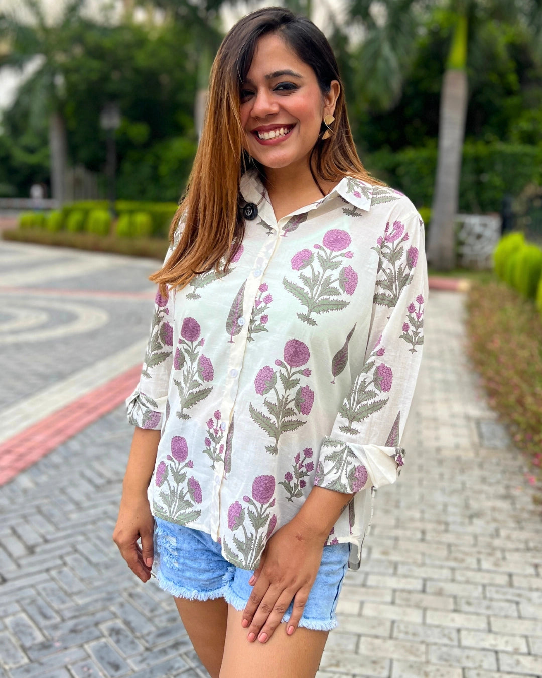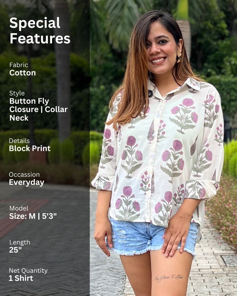 Bring freshness to your wardrobe with our White Cotton Shirt with Blue Floral Print for Women. Made from 100% breathable cotton, it’s your go-to for effortless comfort and style. The crisp white base paired with delicate blue florals adds a soft, graceful touch to your summer looks. With a relaxed fit and folded 3/4th sleeves, it’s perfect for workdays, weekend brunches, or cozy gatherings.