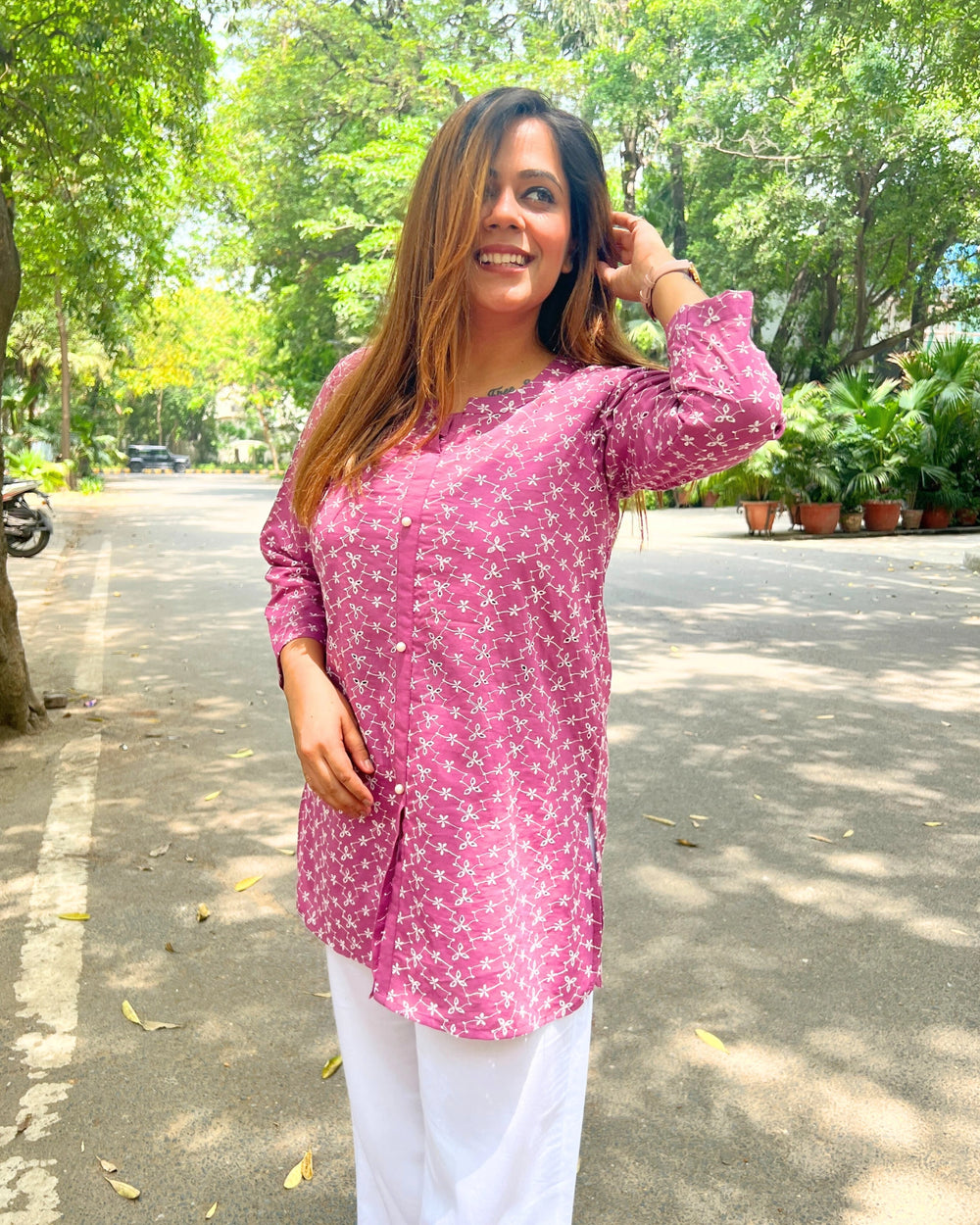 This Women's Pink Embroidered Cotton Shirt is all about soft elegance and breathable comfort. Made from lightweight Schiffli cotton, it features delicate embroidery that adds a graceful charm to your everyday style. The soothing pink shade, round neckline, and 3/4th sleeves make it a perfect pick for warm summer days, whether you're headed to work, brunch, or a casual outing. Style it with white pants, denims, or culottes for a fresh, effortless look.